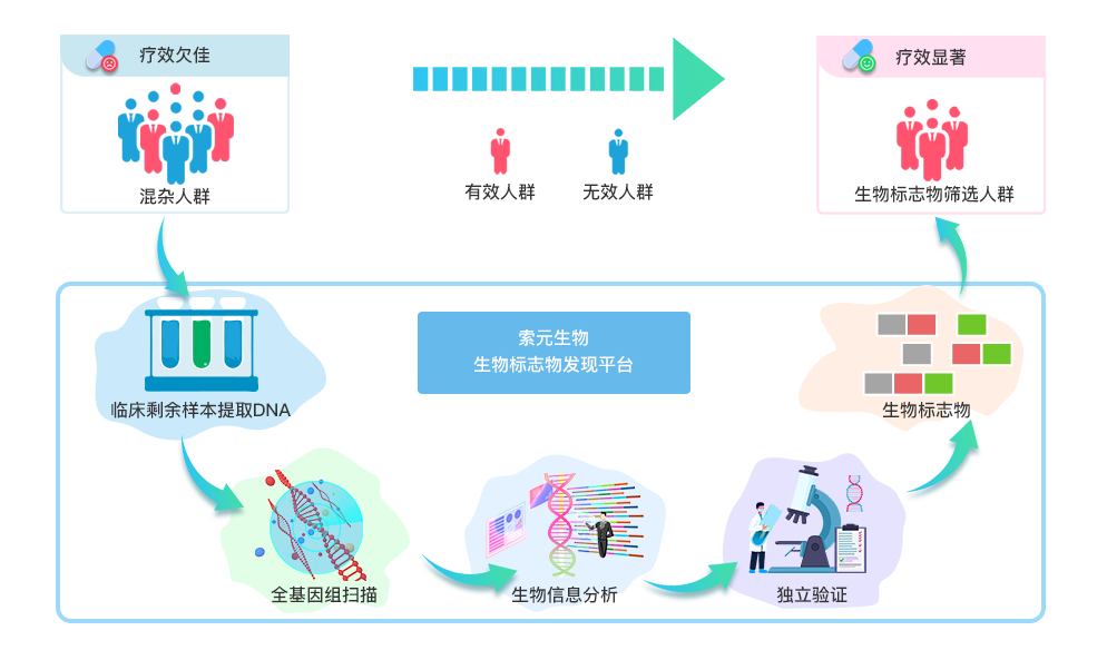 索元生物医药从国际大药厂引进经过临床II、III期试验证明其安全性并对部分病人有效的新药,利用其独创专有的生物标志物平台技术在残余的临床样本中找到可预测药物疗效的生物标志物。通过使用这些新发现的生物标志物作为伴随诊断来筛选病人,索元生物医药能够在敏感患者中重新开展临床试验,从而优化疗效、安全性和耐受性,提高新药的成功率,从而达到以较低的成本、较快的时间开发出一批创新药。